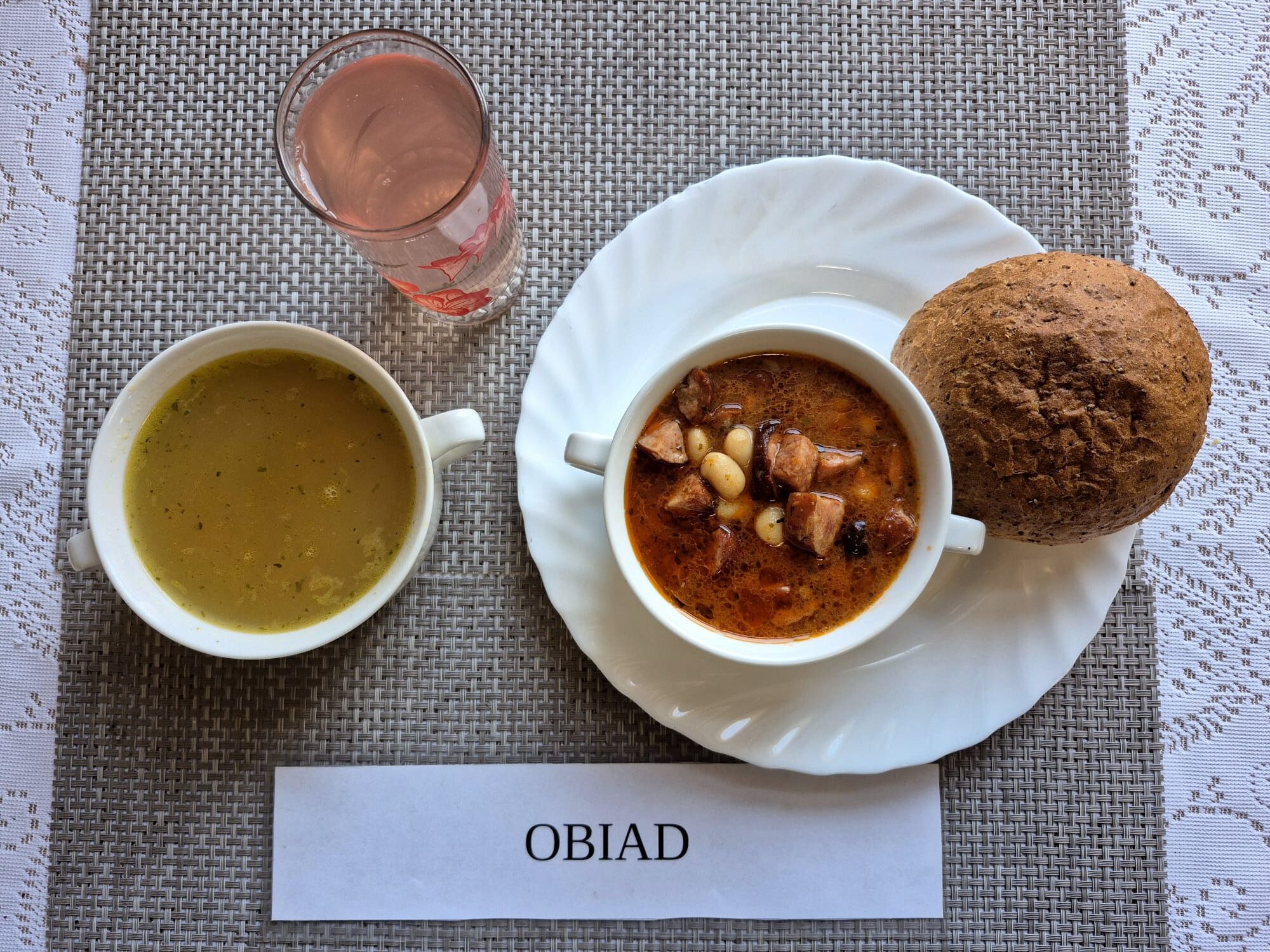 Na zdjęciu znajduję się posiłek w którego skład wchodzi Zupa s soczewicą czerwoną i ziemniakami, Fasolka po bretońsku, Bułka pszenna oraz kompot z jabłek
